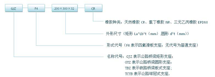 示例1:公路橋梁矩形普通氯丁橡膠支座,短邊尺寸為300mm,長(zhǎng)邊尺寸為400mm,厚度為47mm,表示為:GJZ300×400×47(CR)。